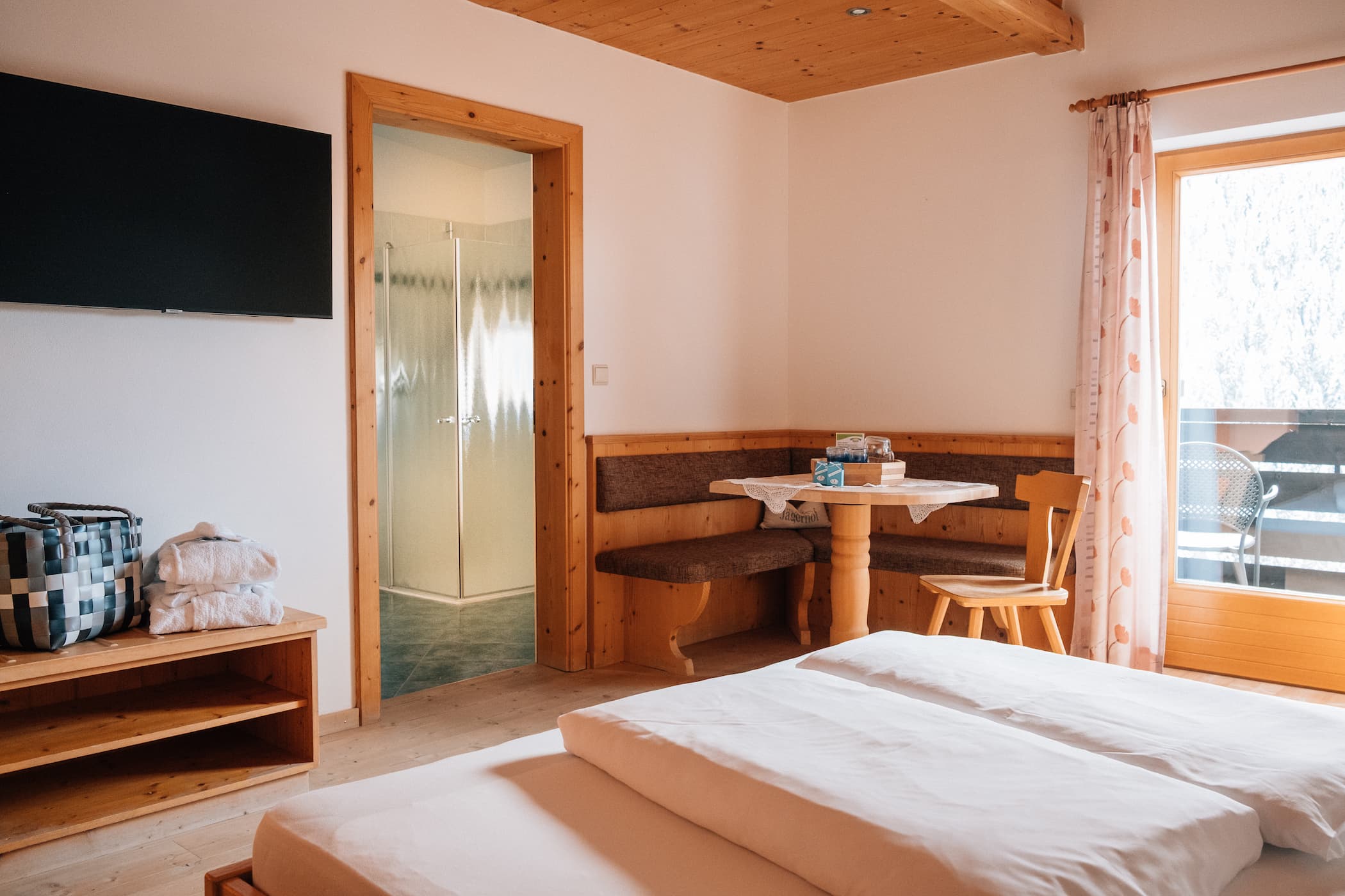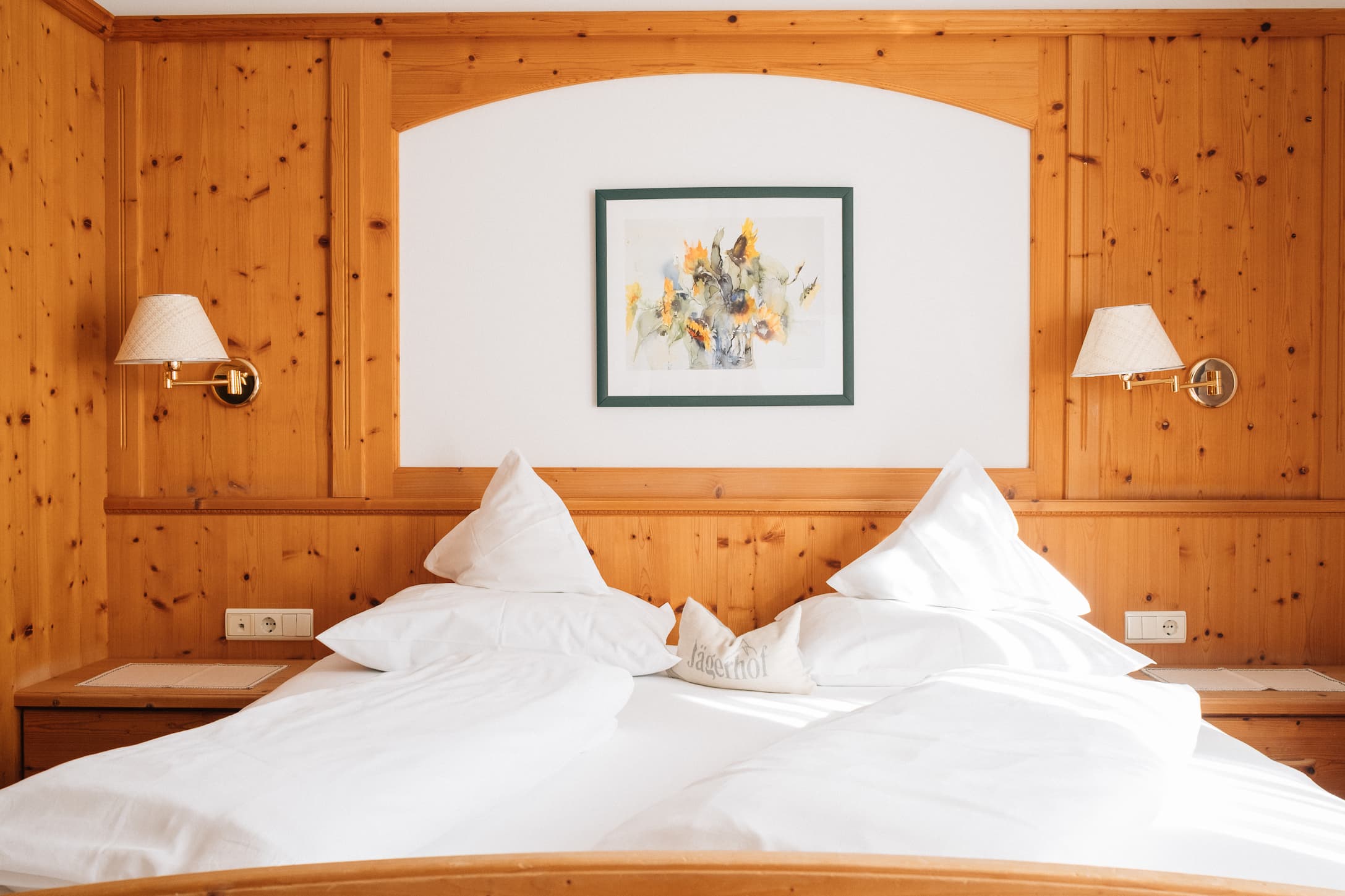 At the Jägerhof, you stay in rooms made from natural materials, with solid wood furniture crafted by local Passeier carpenters, warm wooden floors, and thoughtful details. Modern comfort meets authentic South Tyrolean living here.